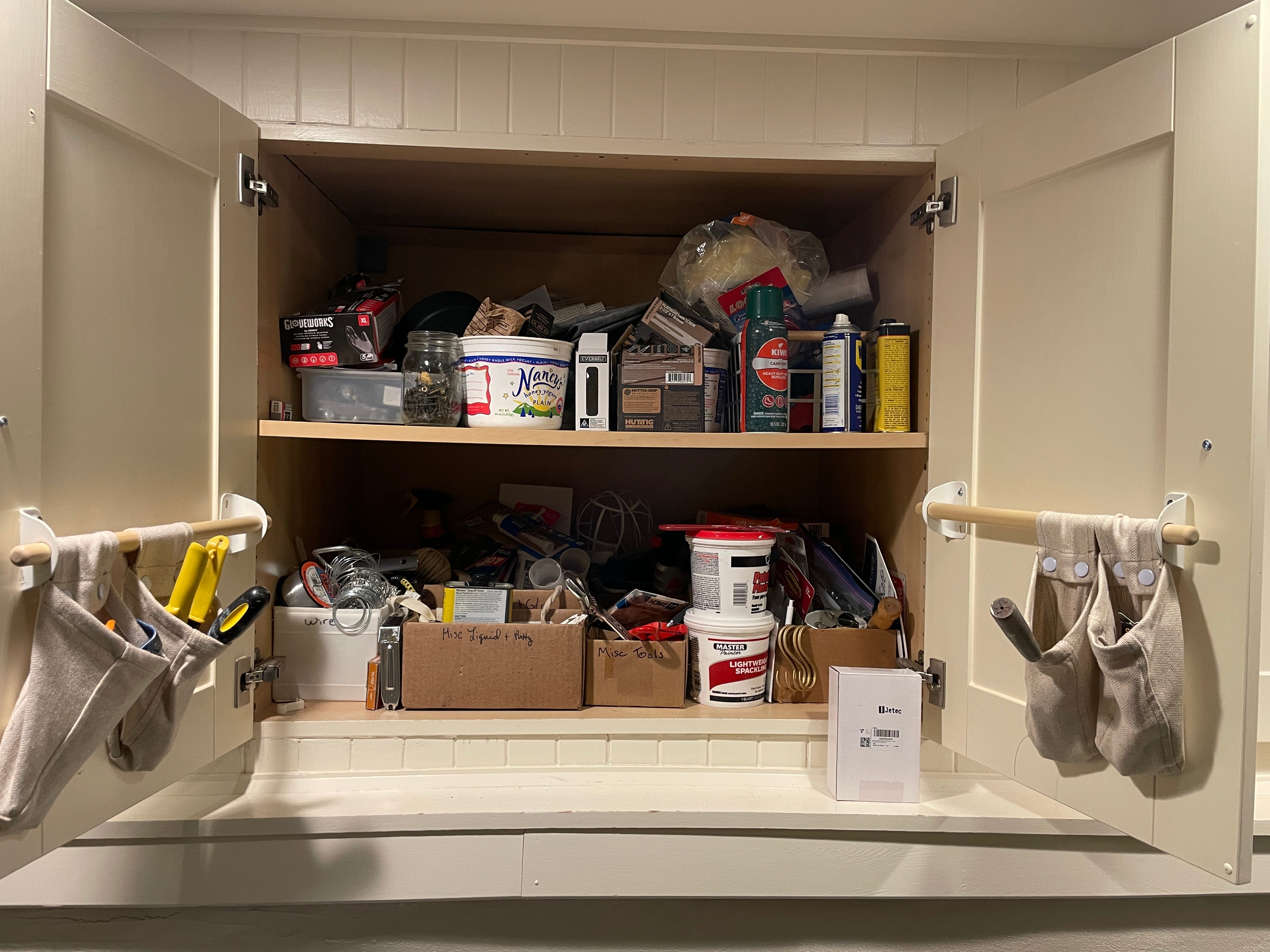 The tool cabinet started innocently enough. When we moved in, I dutifully sorted all our tools into bespoke containers, favoring old yogurt tubs and recycled cardboard boxes due to my anti-bin beliefs. Ever the good girl, I labeled everything as though a label could resist the force of a black hole.
