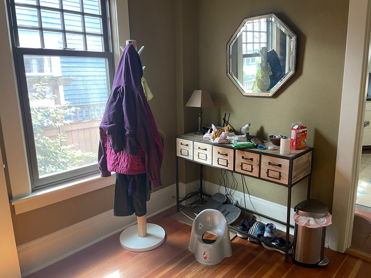 We were able to consolidate shoes to just two spots: the entryway built-in bench for the dad and kid’s shoes, and the hallway closet for the mom’s shoes.