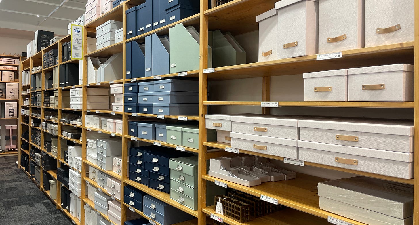 I don’t know the answer, but what I do know is that my heart races every time I’m there, and not in a good way. I’m not trying to pick on the Container Store itself, but rather what it represents as a symbol of organizing culture at large. The Container Store is just plugging along every day, doing its best to deliver value to shareholders and its private equity owners. It grossed $900 million last year so clearly not everyone is as conflicted about the place as I am.